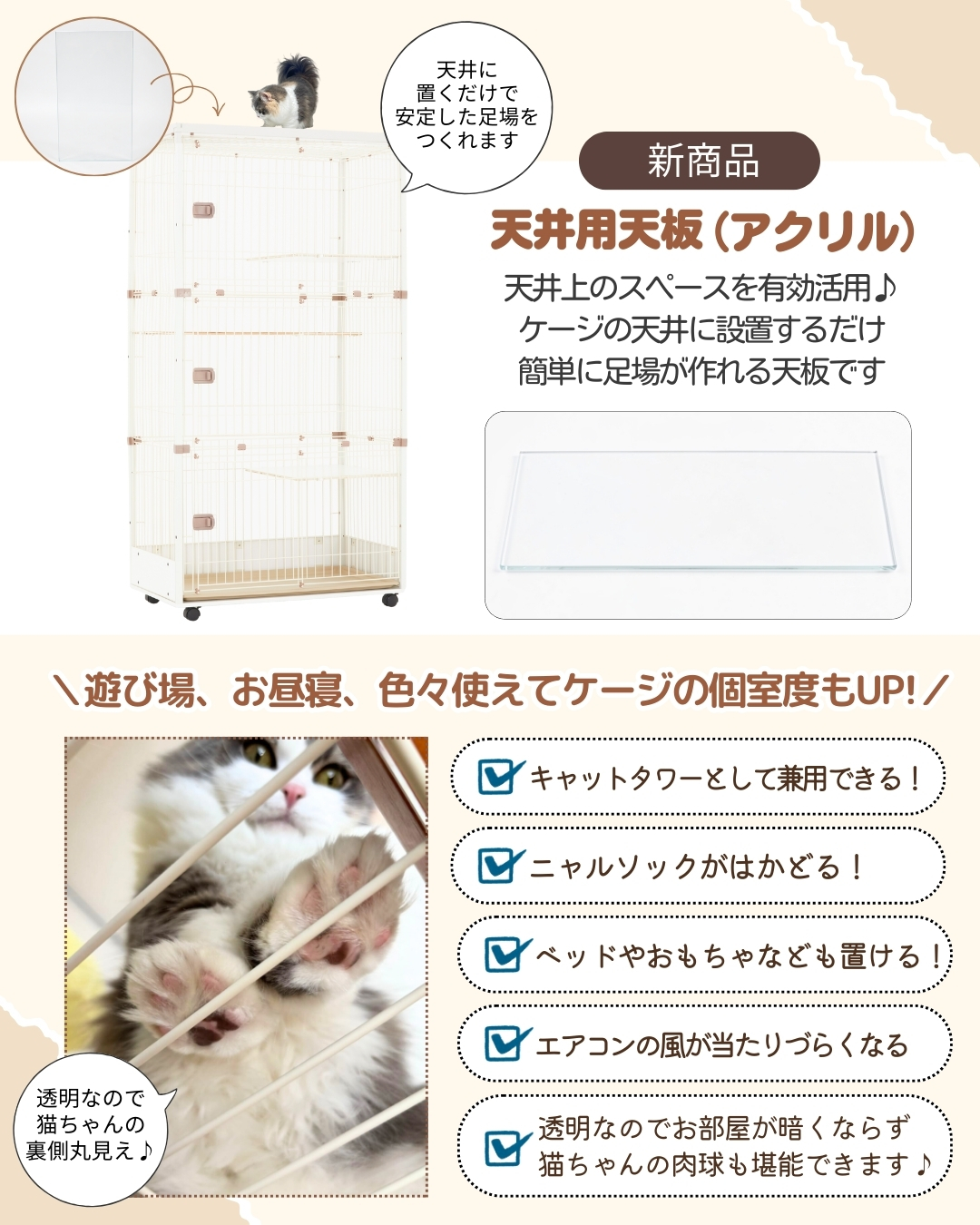 ケージの天井に設置するだけ簡単に足場が作れる天板です。