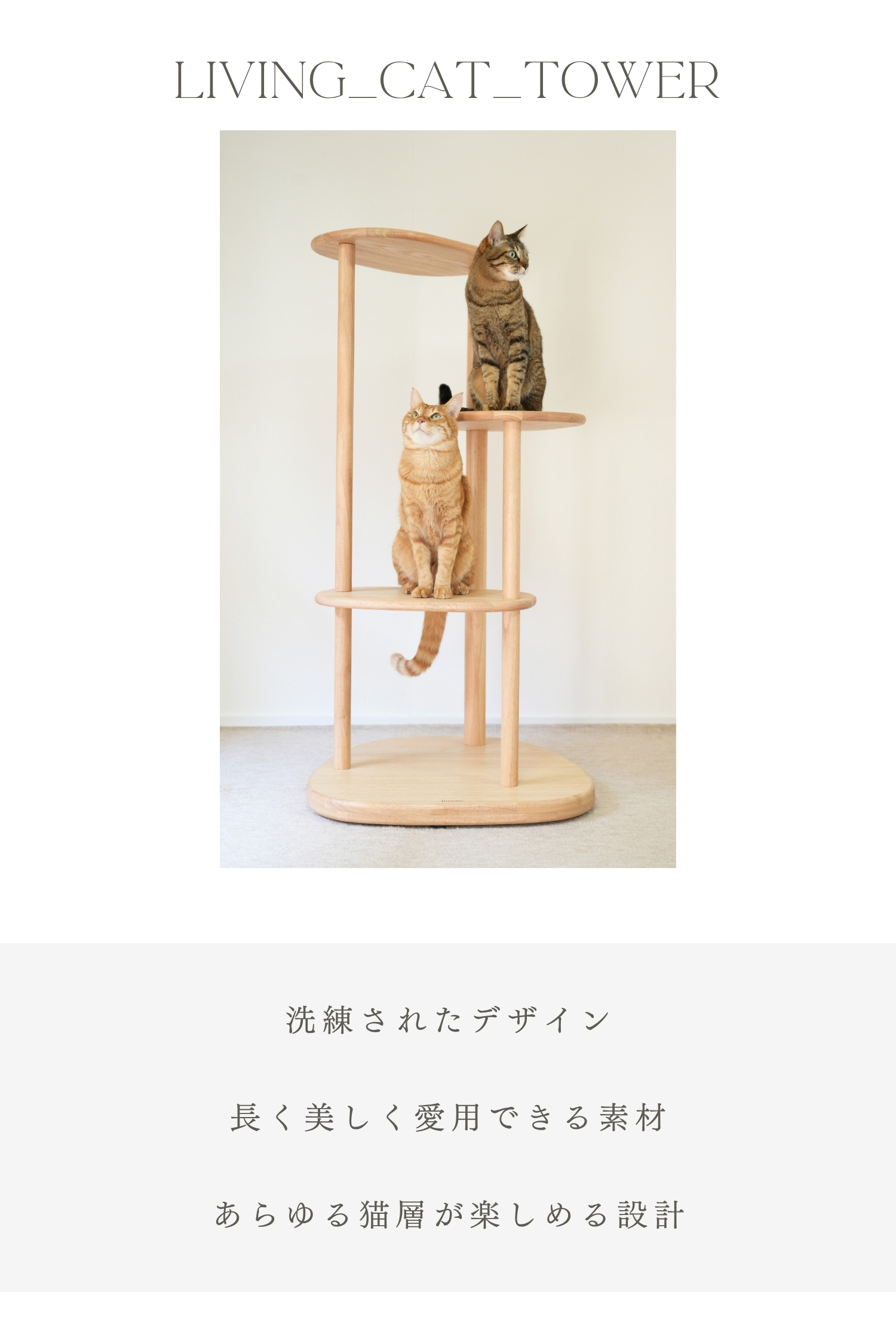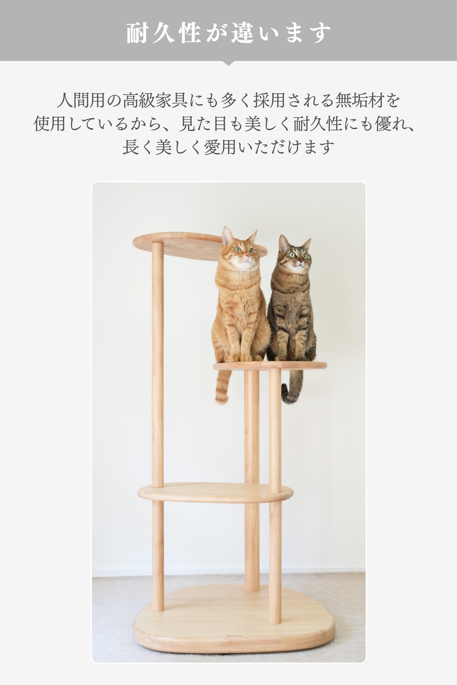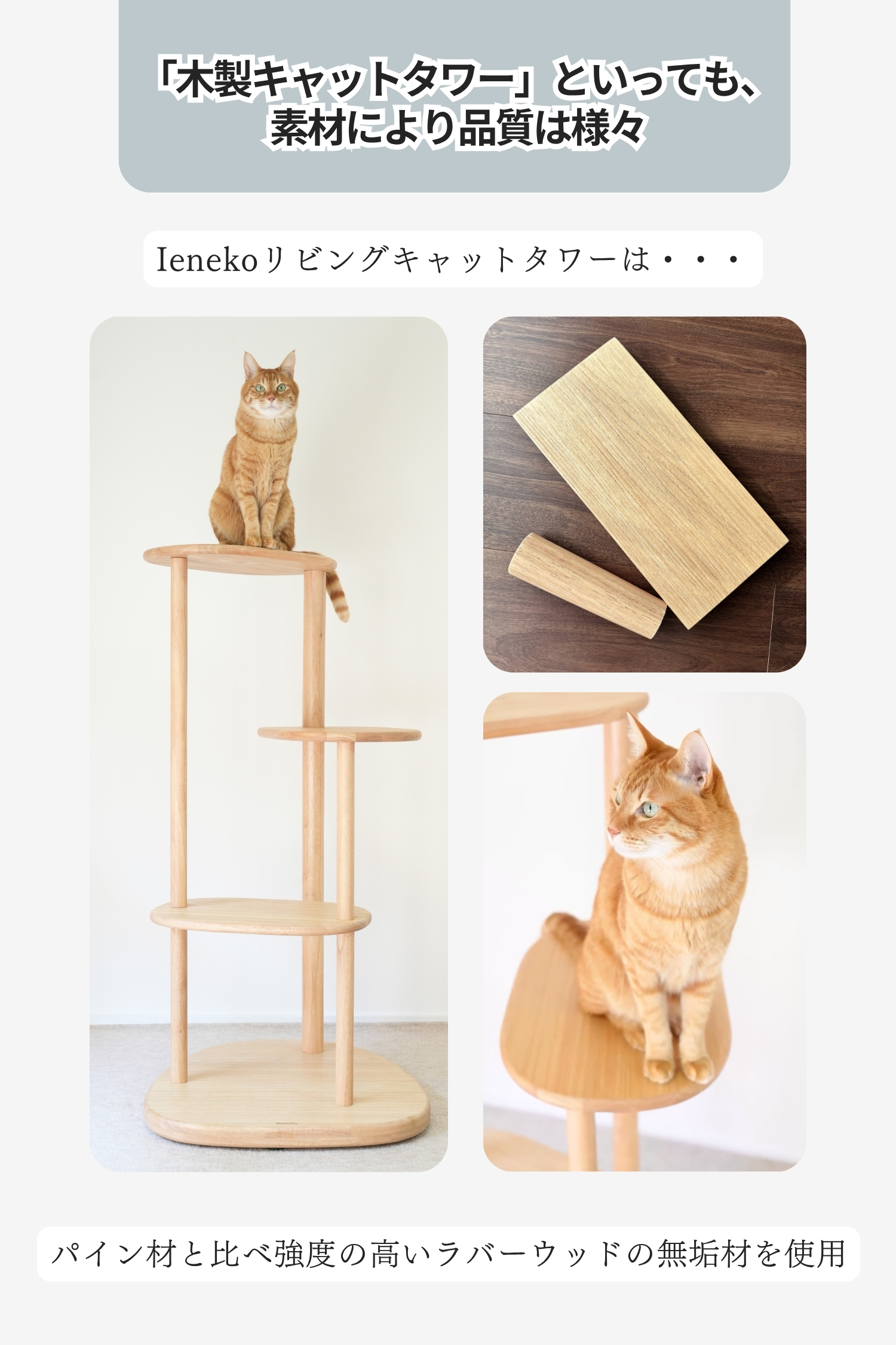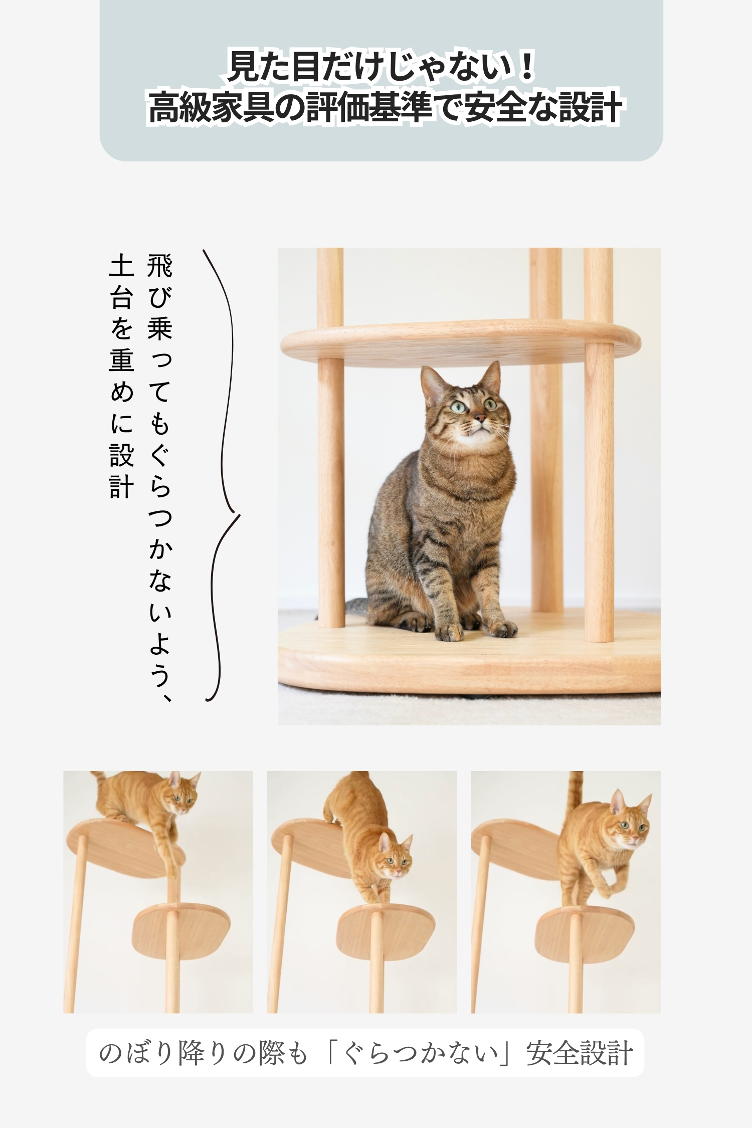 ラバーウッドの無垢材を使用した、インテリアになじむキャットタワー。浮造り加工で滑りづらく、土台重心・滑り止め付で安定感バツグンだから安心。