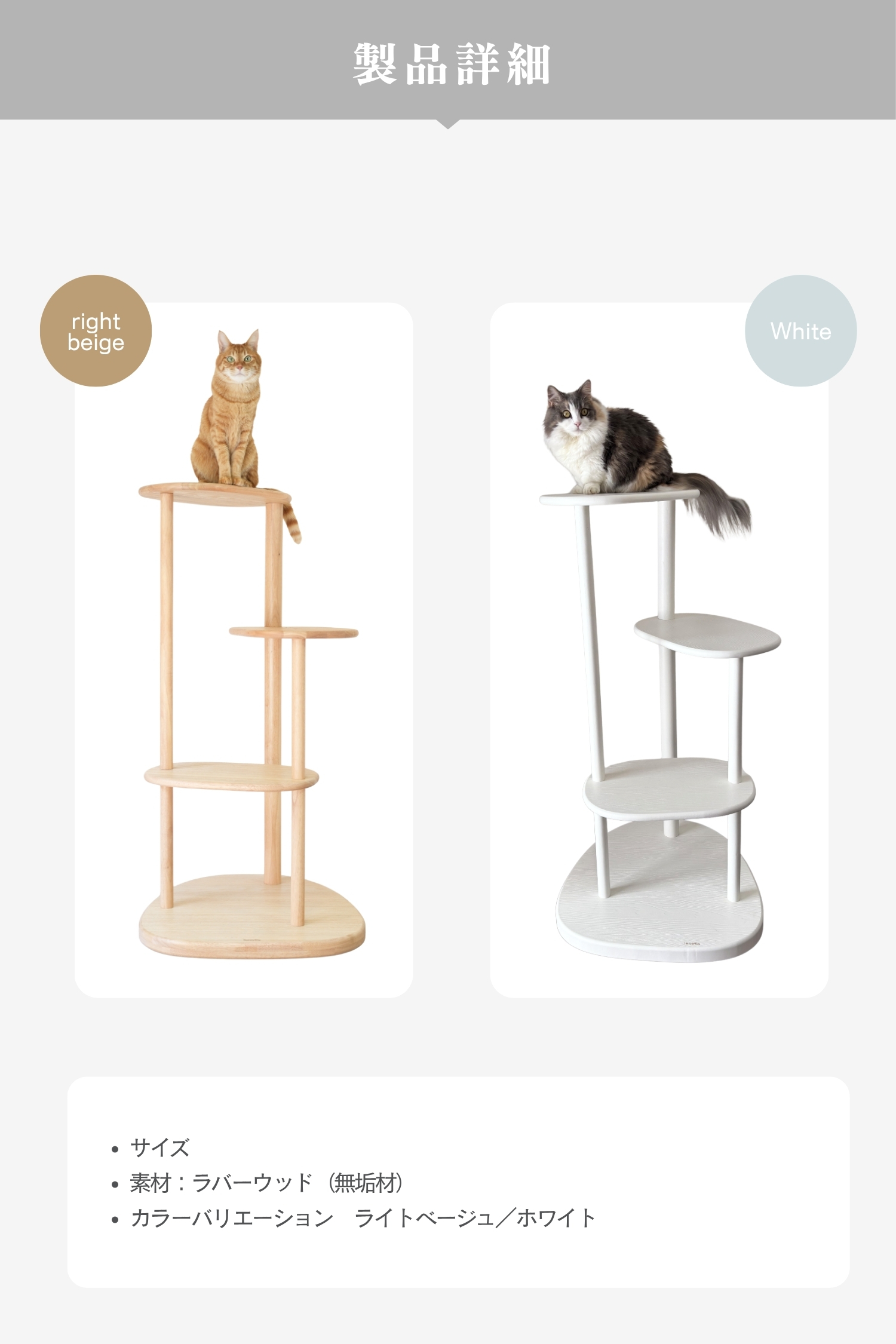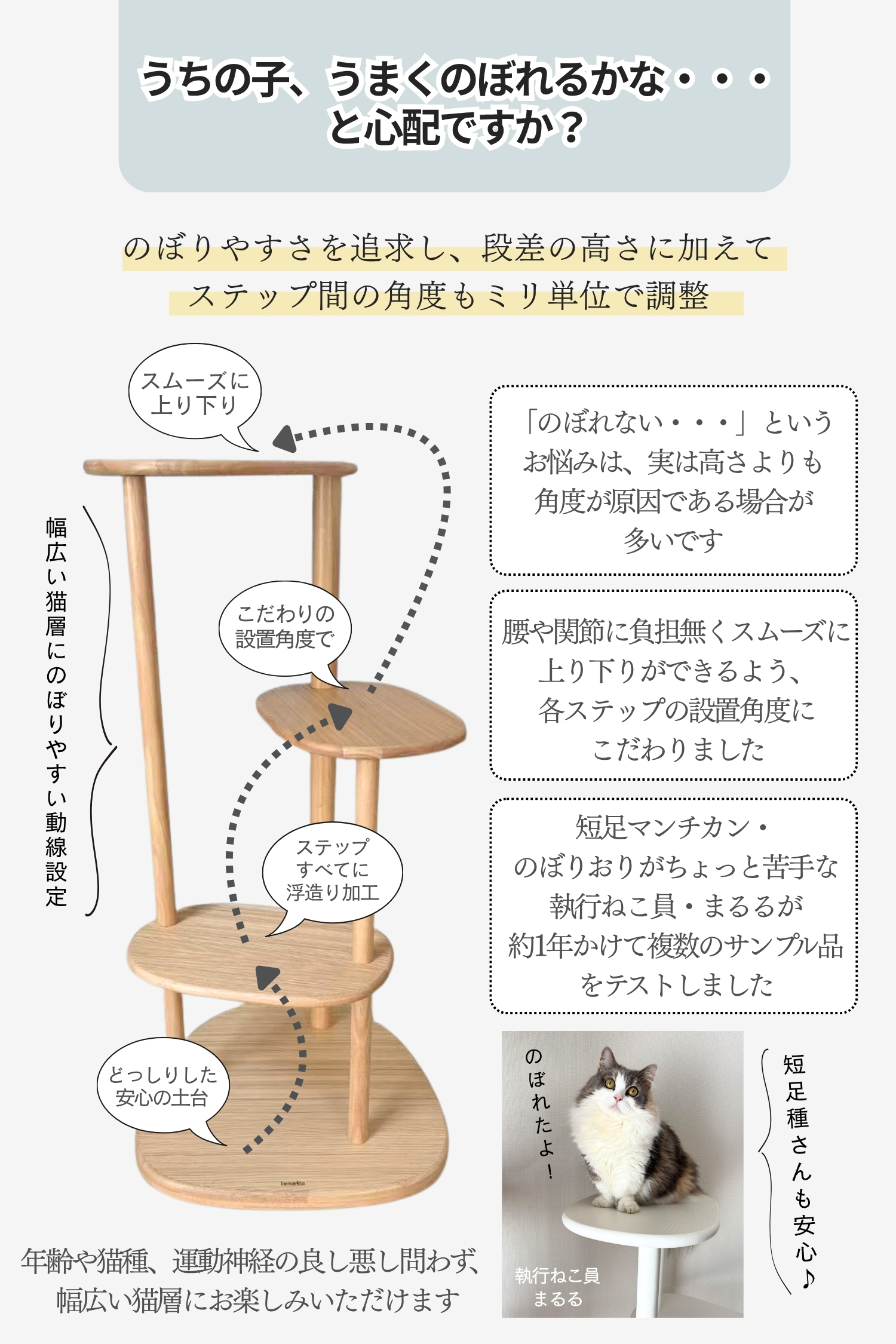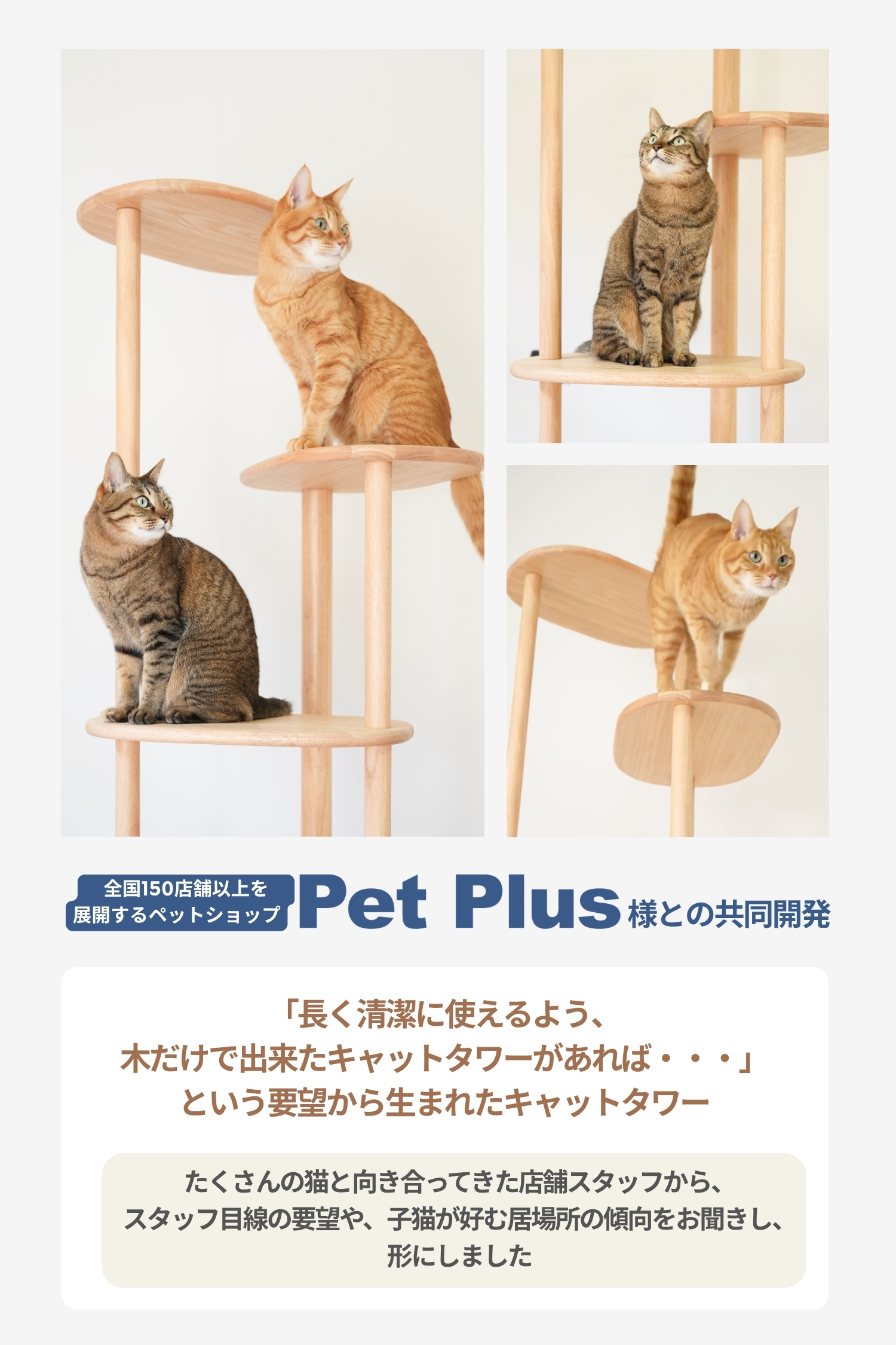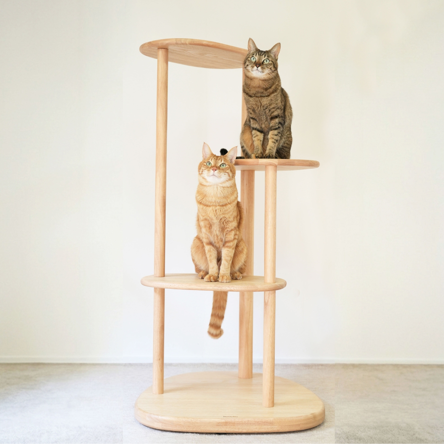 ラバーウッドの無垢材を使用した、インテリアになじむキャットタワー。浮造り加工で滑りづらく、土台重心・滑り止め付で安定感バツグンだから安心。