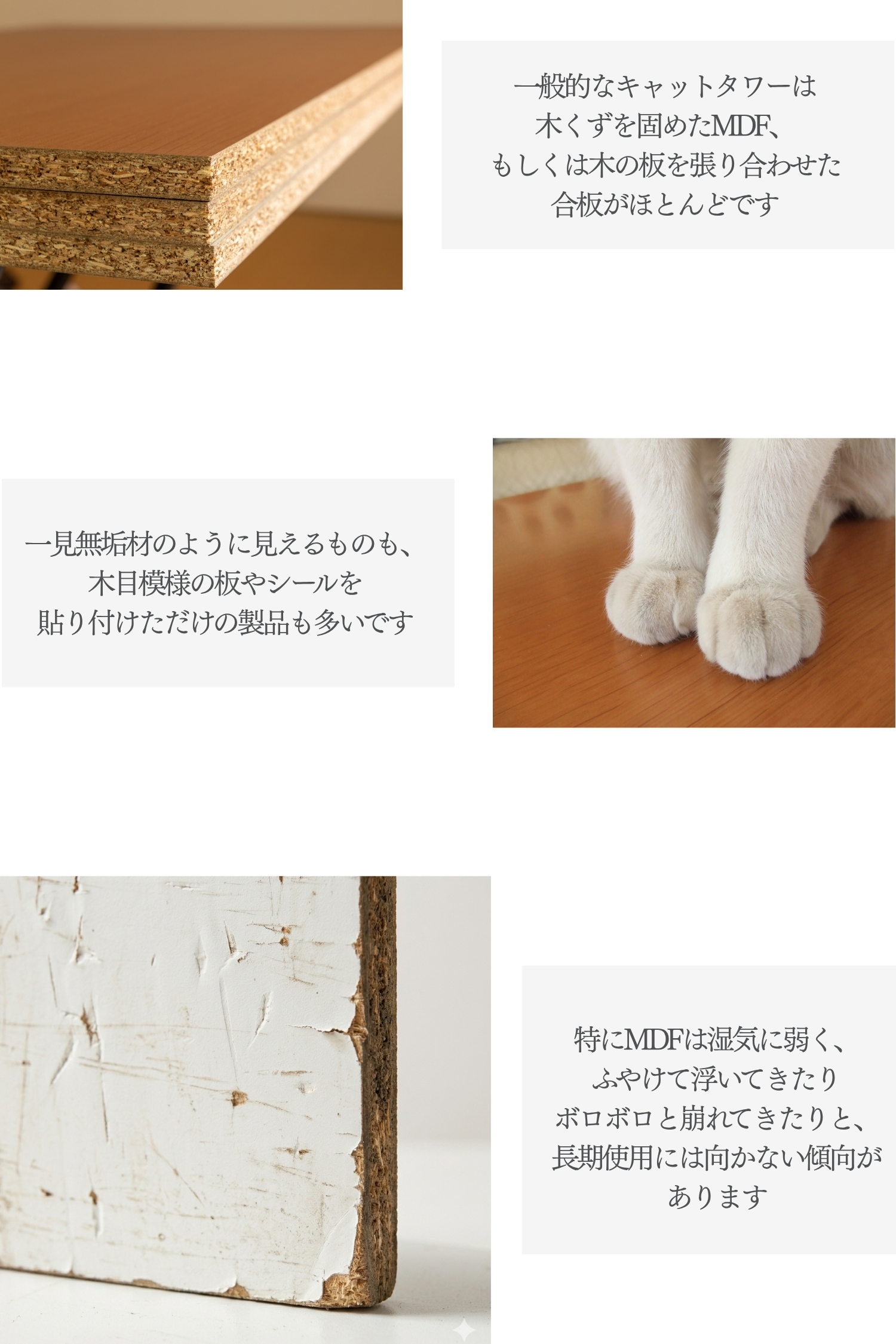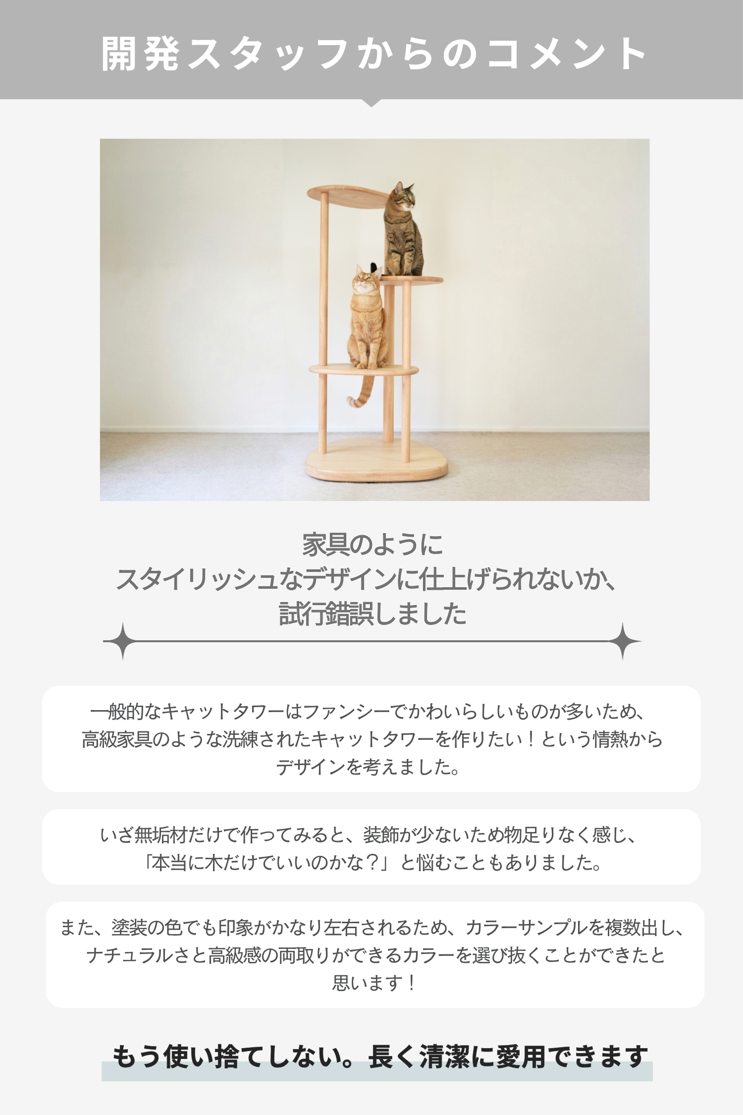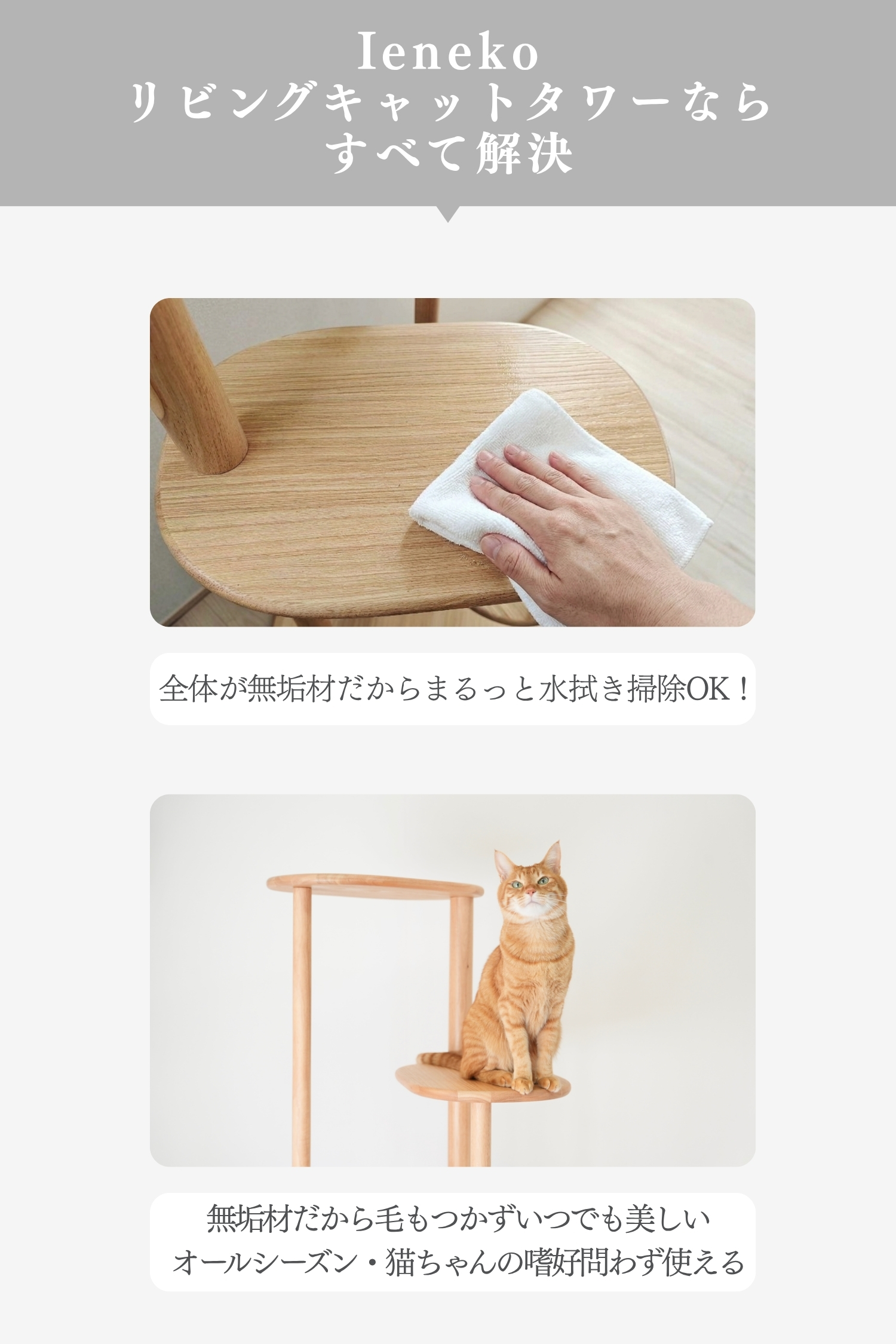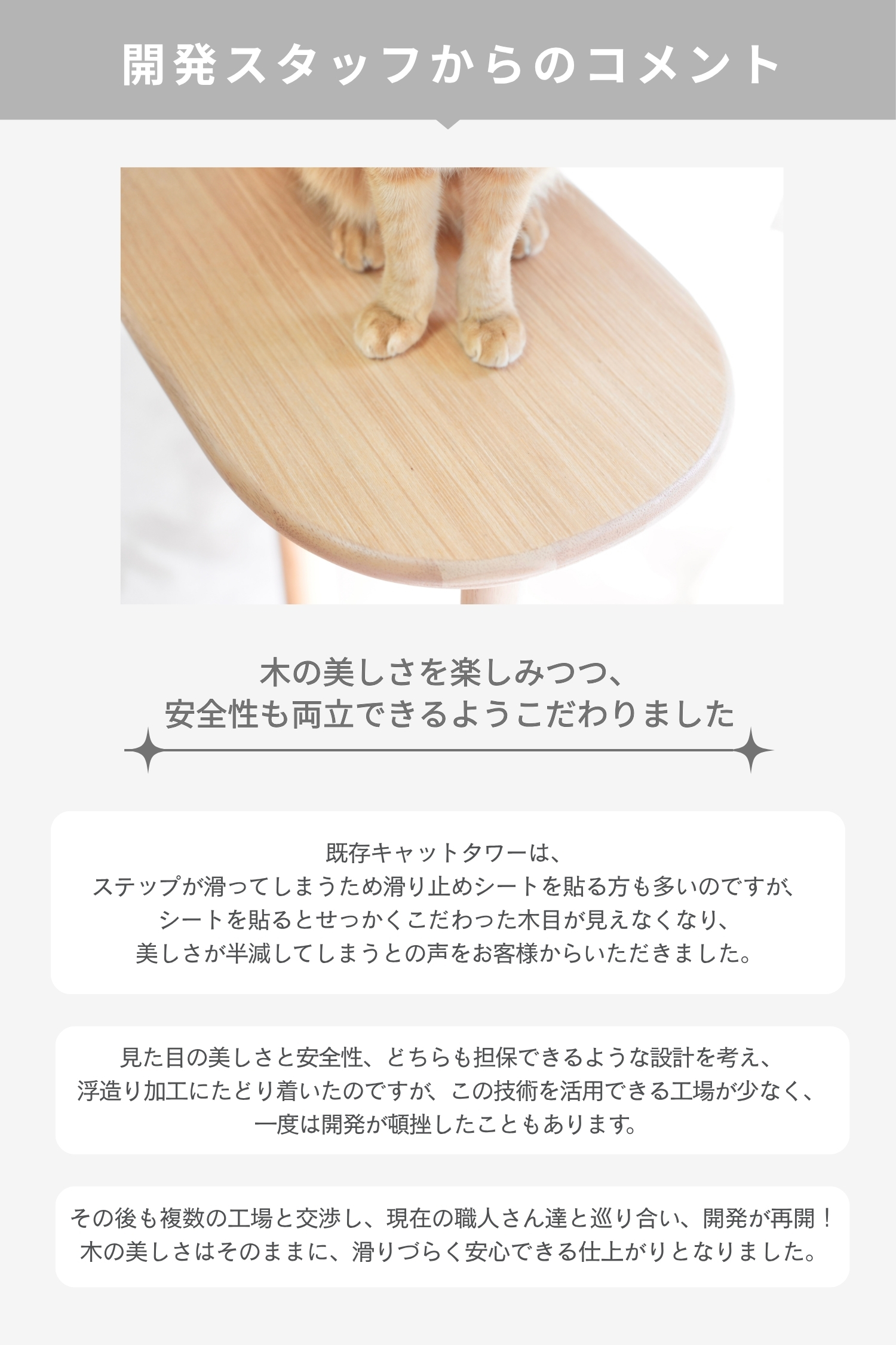 ラバーウッドの無垢材を使用した、インテリアになじむキャットタワー。浮造り加工で滑りづらく、土台重心・滑り止め付で安定感バツグンだから安心。