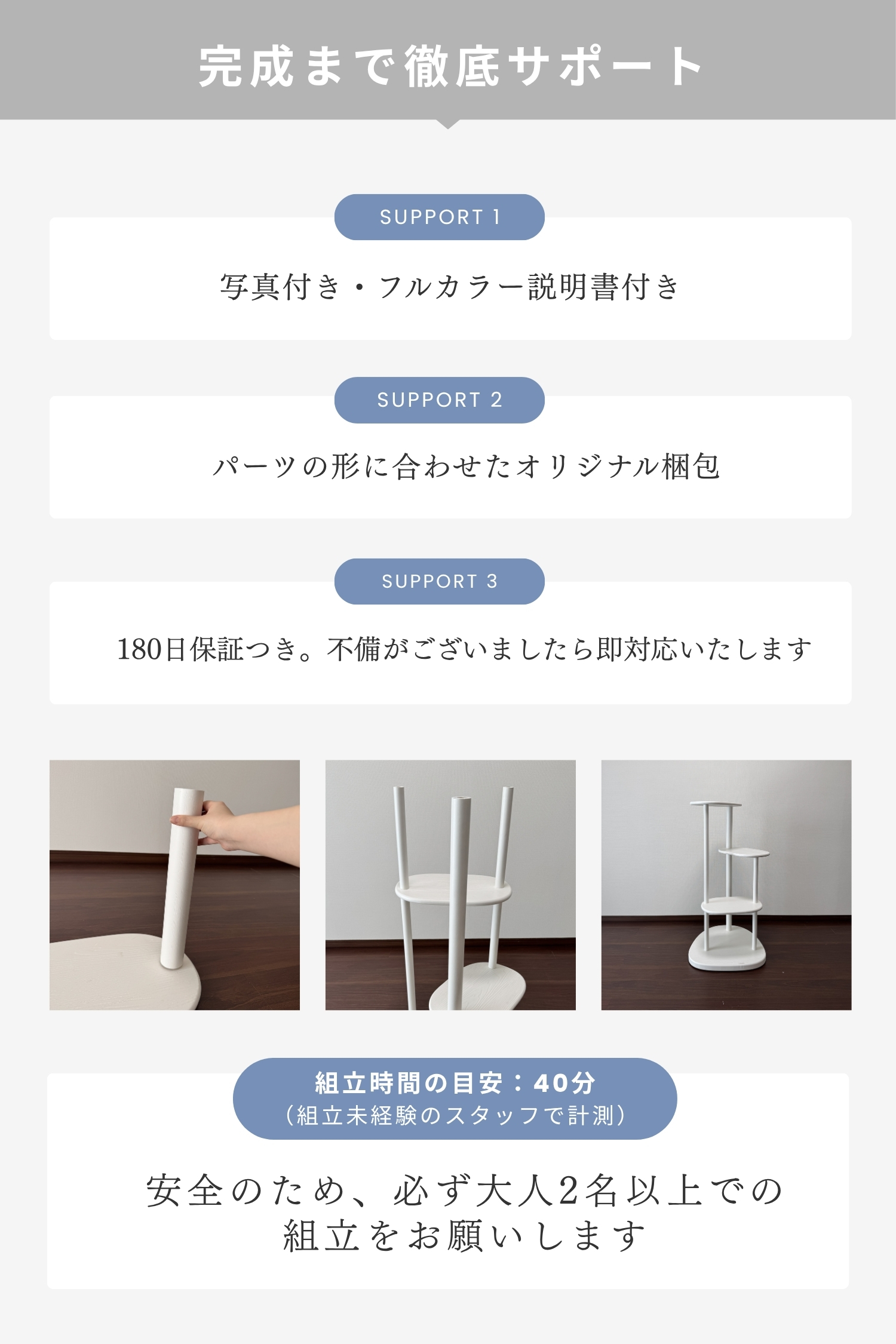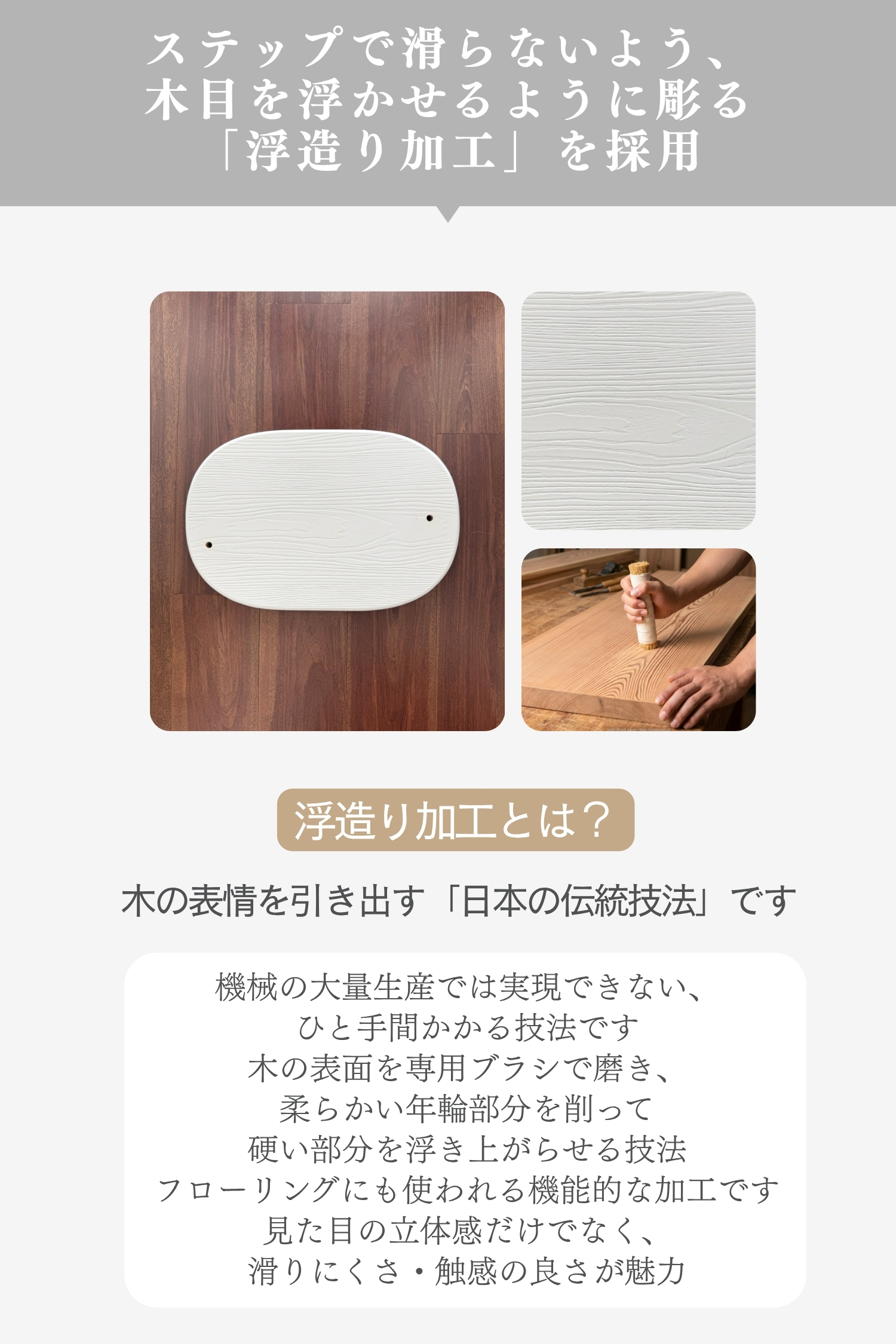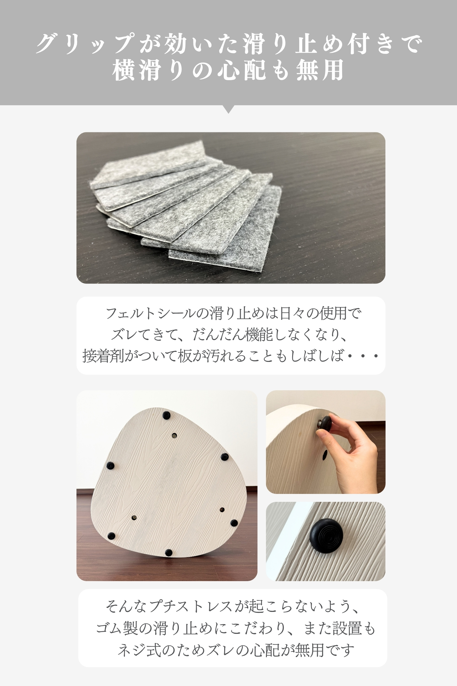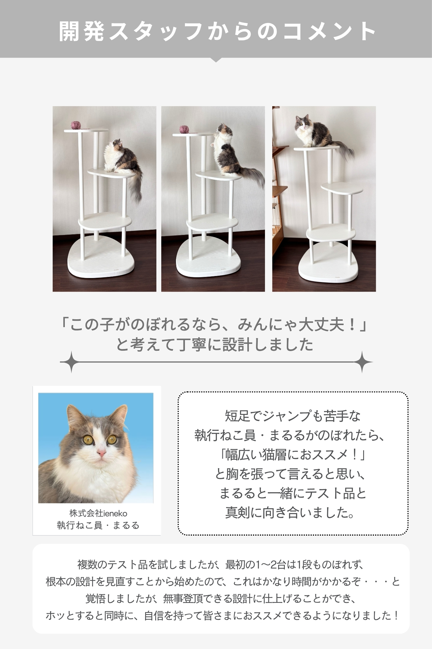 ラバーウッドの無垢材を使用した、インテリアになじむキャットタワー。浮造り加工で滑りづらく、土台重心・滑り止め付で安定感バツグンだから安心。