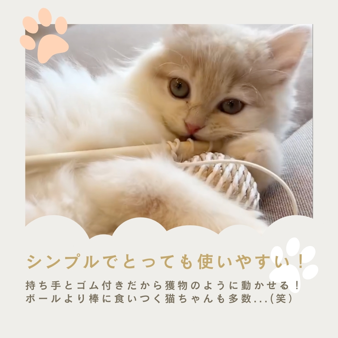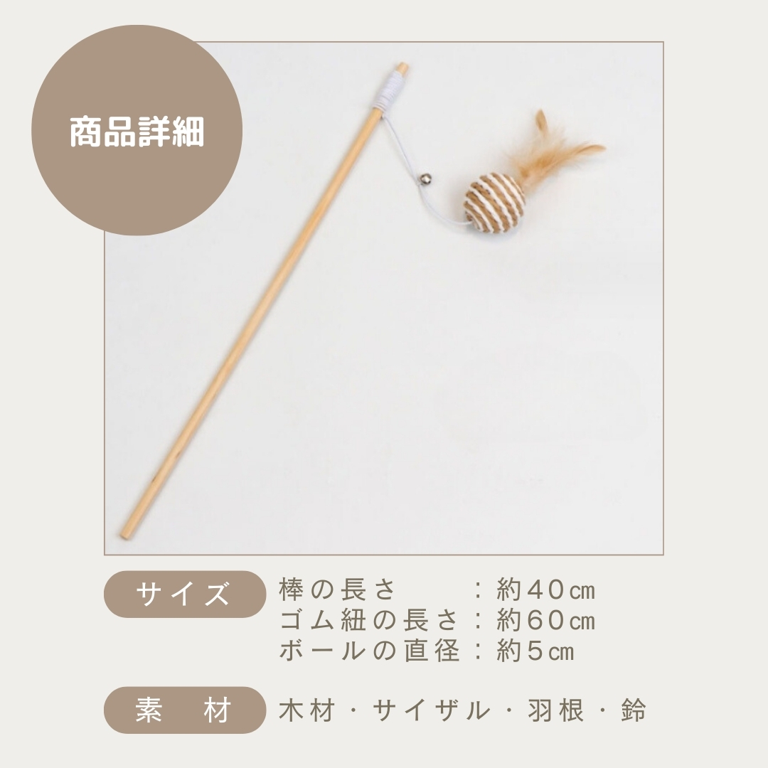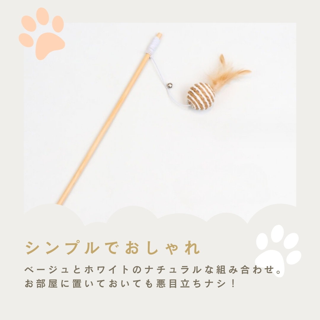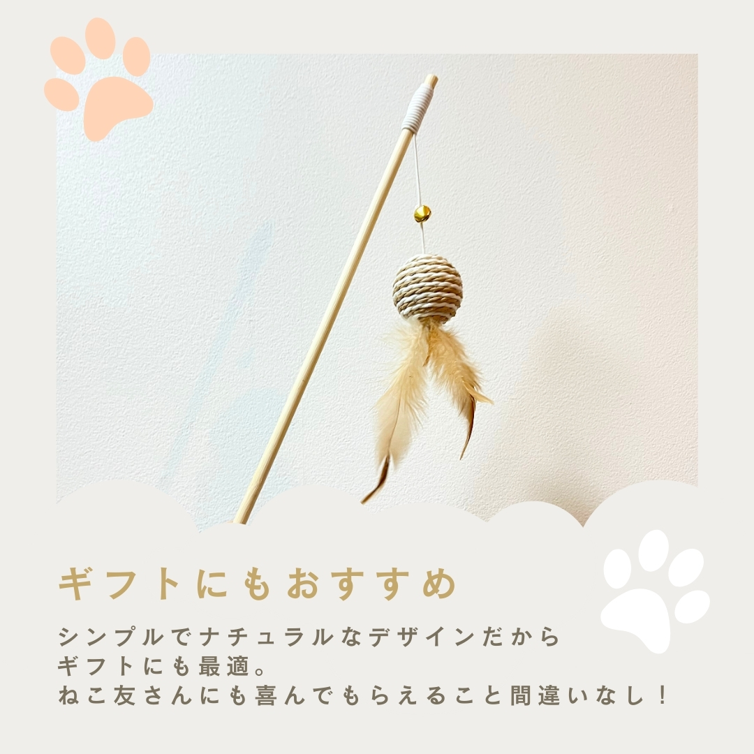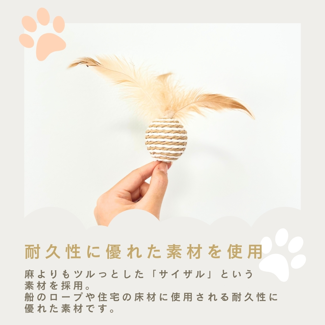 カラカラと音が鳴るボールに羽根が付いた、棒付きおもちゃです。ボールには耐久性に優れたサイザルという素材を使用し、パワフルな猫ちゃんでも思い切り遊べる設計を目指しました。シンプルながら至高のおもちゃ!