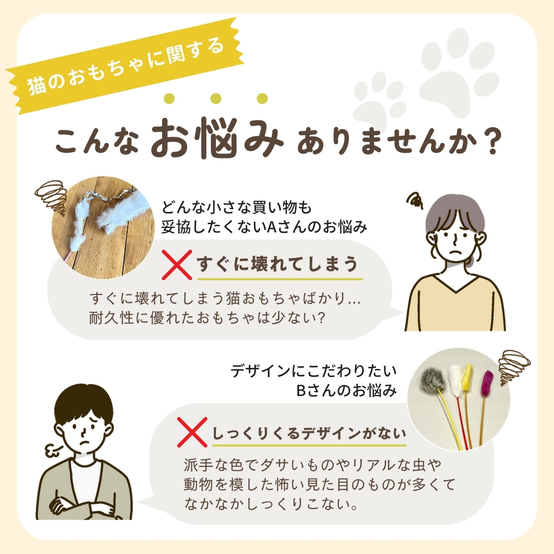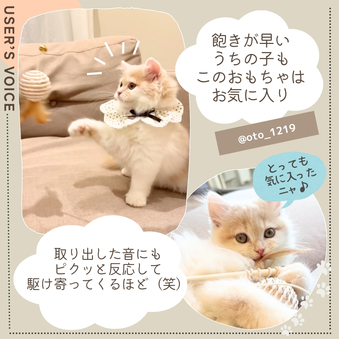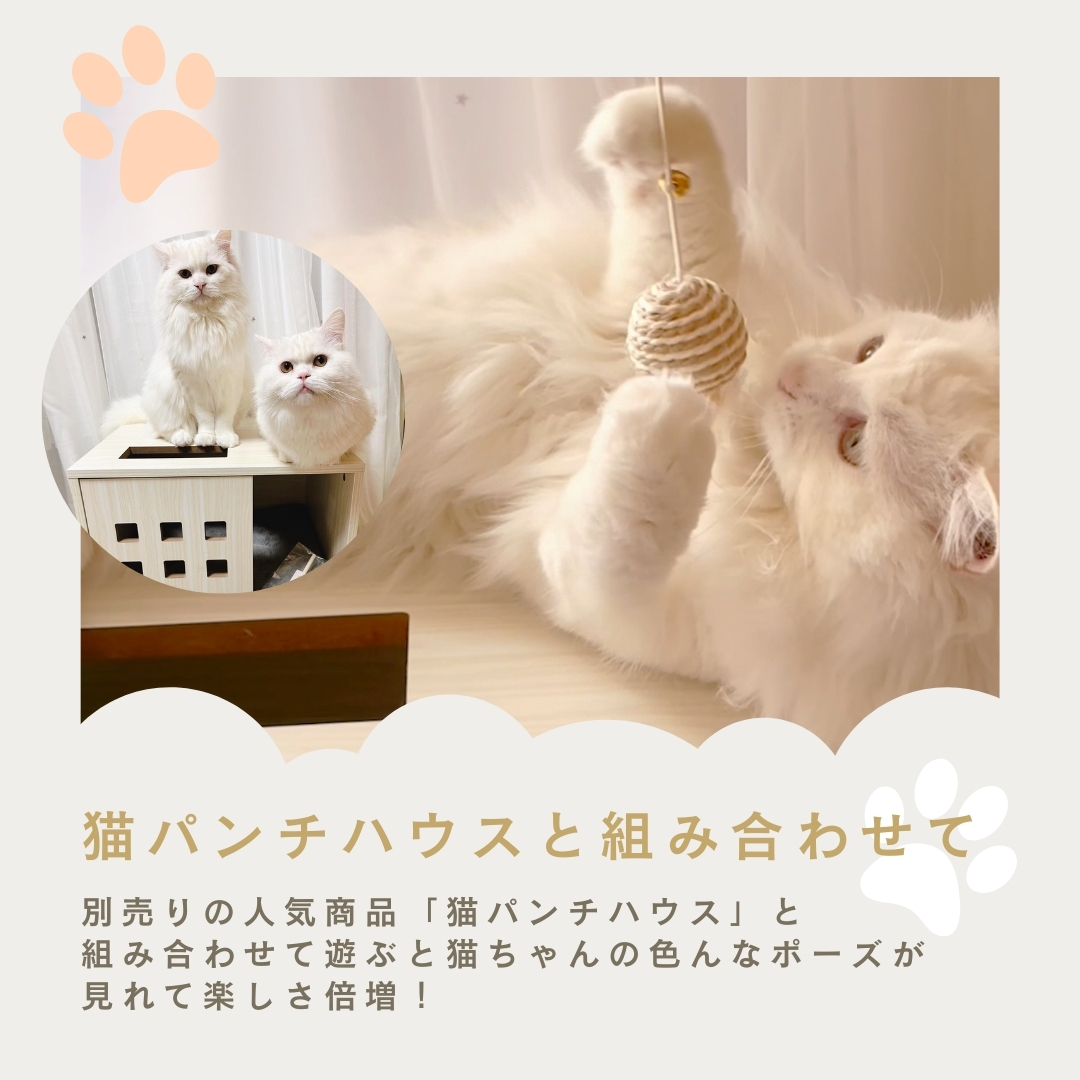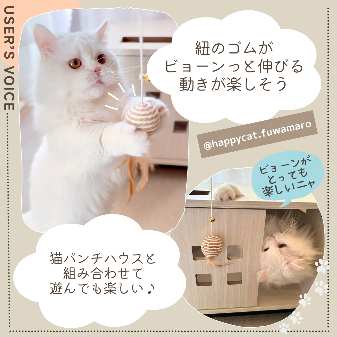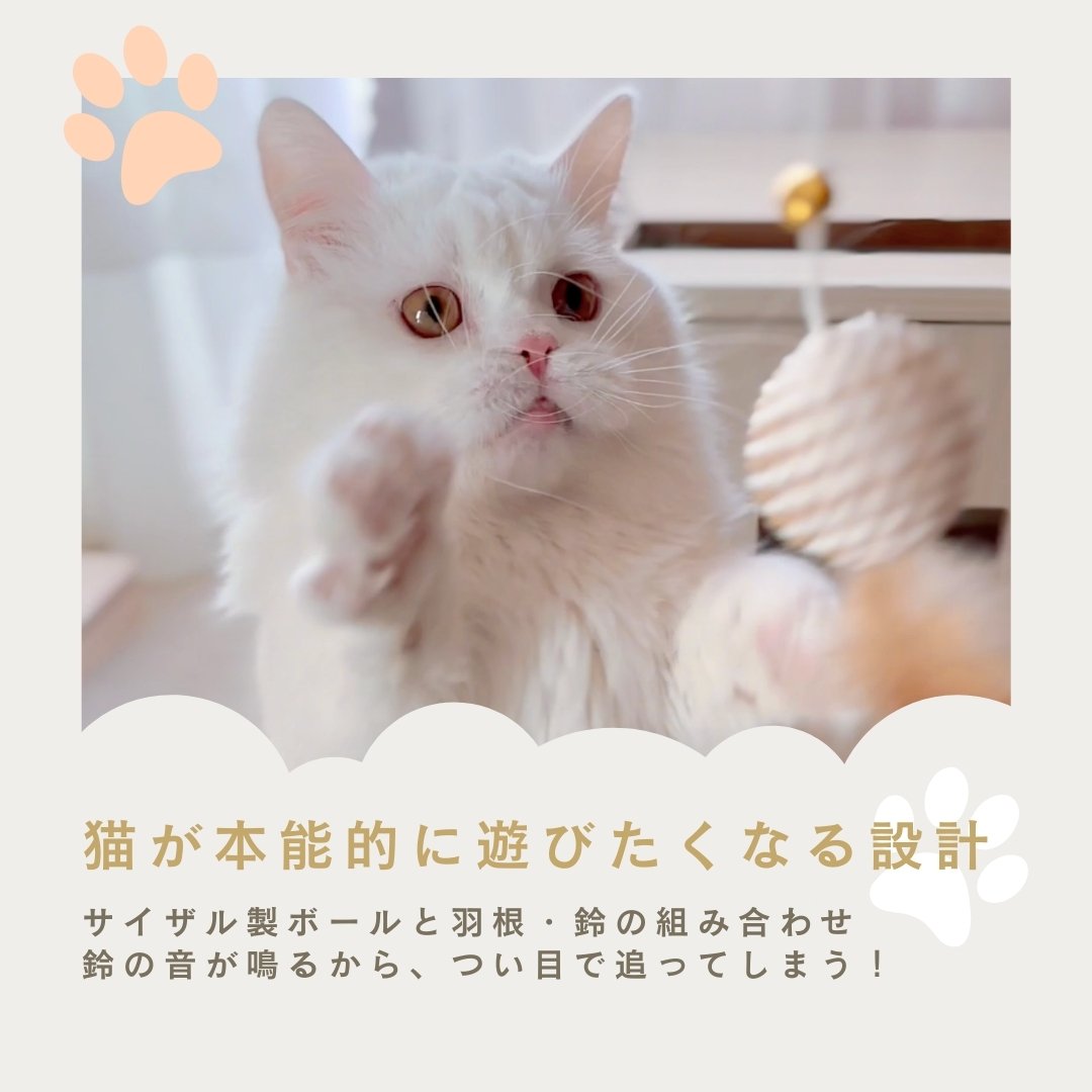 カラカラと音が鳴るボールに羽根が付いた、棒付きおもちゃです。ボールには耐久性に優れたサイザルという素材を使用し、パワフルな猫ちゃんでも思い切り遊べる設計を目指しました。シンプルながら至高のおもちゃ!